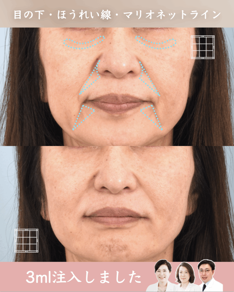 そこで今回は①のしわに注入する方法でしわをうすくしつつ、リフトアップ感まで感じられるように施術をおこなった症例をご紹介します。